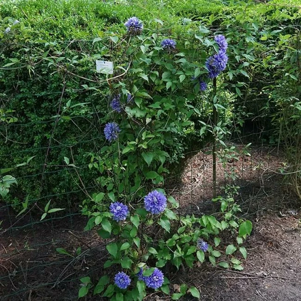 Plante grimpante. Clématite à grandes fleurs doubles de 10 à 15 cm de diamètre, de couleur bleu violacé. Floraison printanière remontante en été. S’enroule seule sur son support grace à son feuillage.
