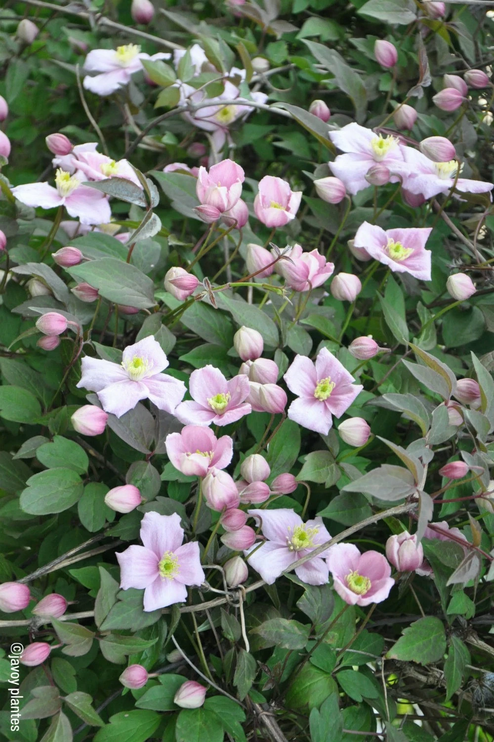 un léger parfum pour cette clématite des montagnes à floraison rose tendre. Nombreuses, les fleurs de la clématite ‘mayleen’ sont simples, de petite taille, pas plus de 6 cm, composées de 4 pétales et d’un coeur d’étamines jaune poussin. Sa floraison hâtive en fait une variété très intéressante puisqu’elle va commencer à fleurir dès le mois de mai et peut avoir des remontées de fleurs en plein été !