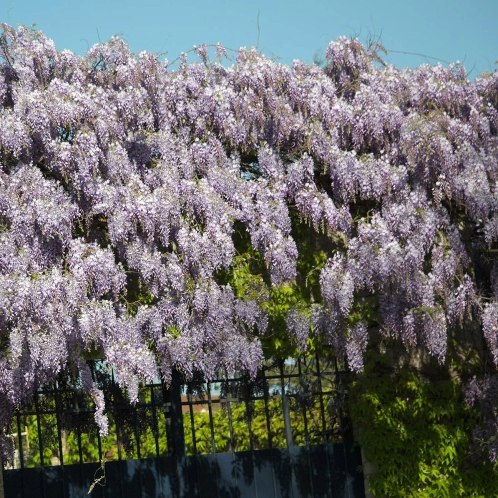 la floraison massive bleu-violet soutenue, en grappes de 35 à 50 fleurs et de 20 à 30 cm de long, surgit avant l’apparition du feuillage. C’est la glycine la plus répandue et la seule à refleurir plus ou moins abondamment pendant l’été. Ces fleurs dégagent un très agréable parfum.