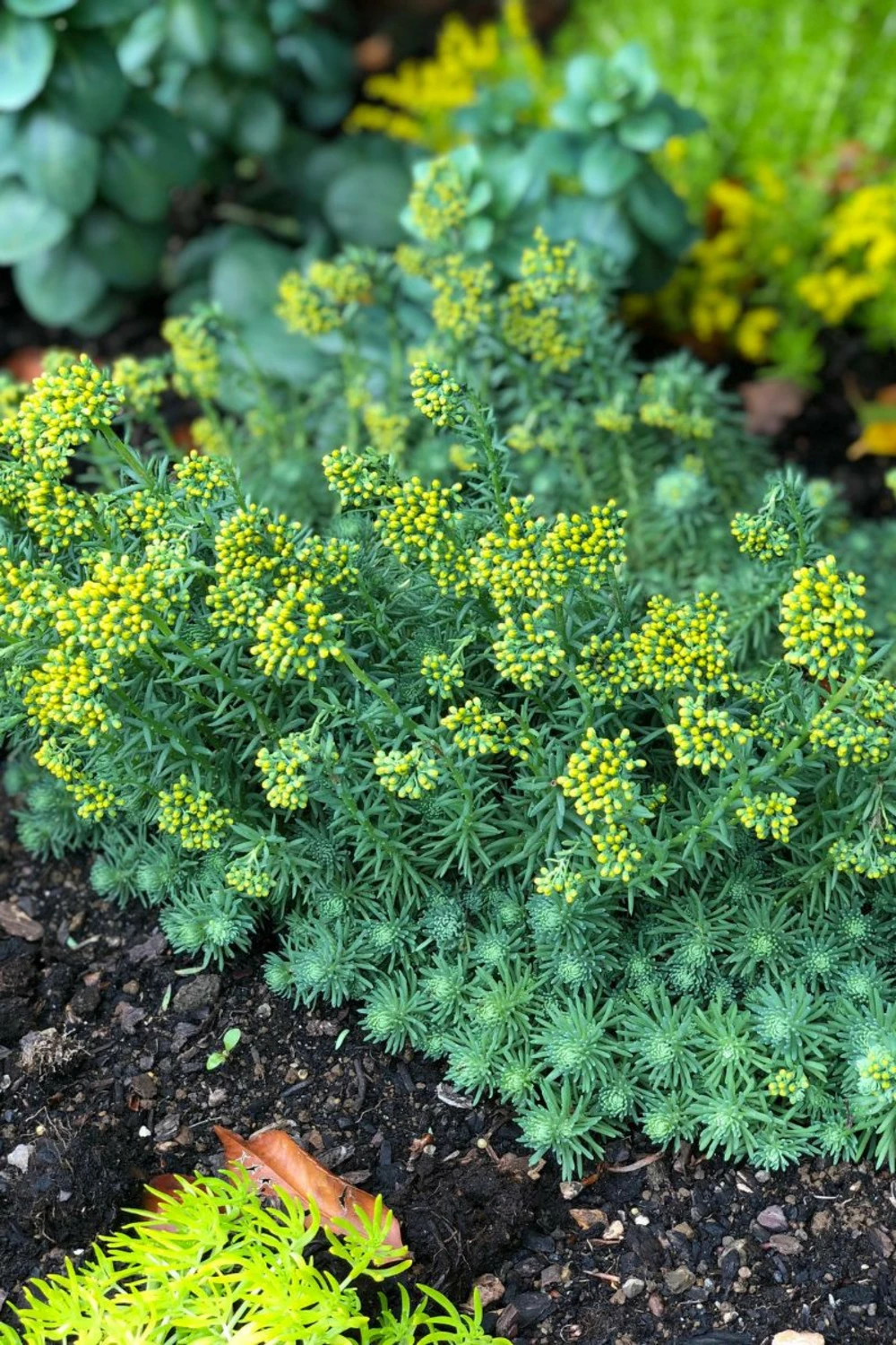en rocaille ou en pot, cette plante vivace habille parfaitement et propose de la hauteur. A la fin de l’Ă©tĂ©, de très jolies fleurs jaune or en forme d’Ă©toiles apportent une touche dĂ©licate. La couleur de son feuillage permet de l’associer Ă des plantes aux teintes chaudes.